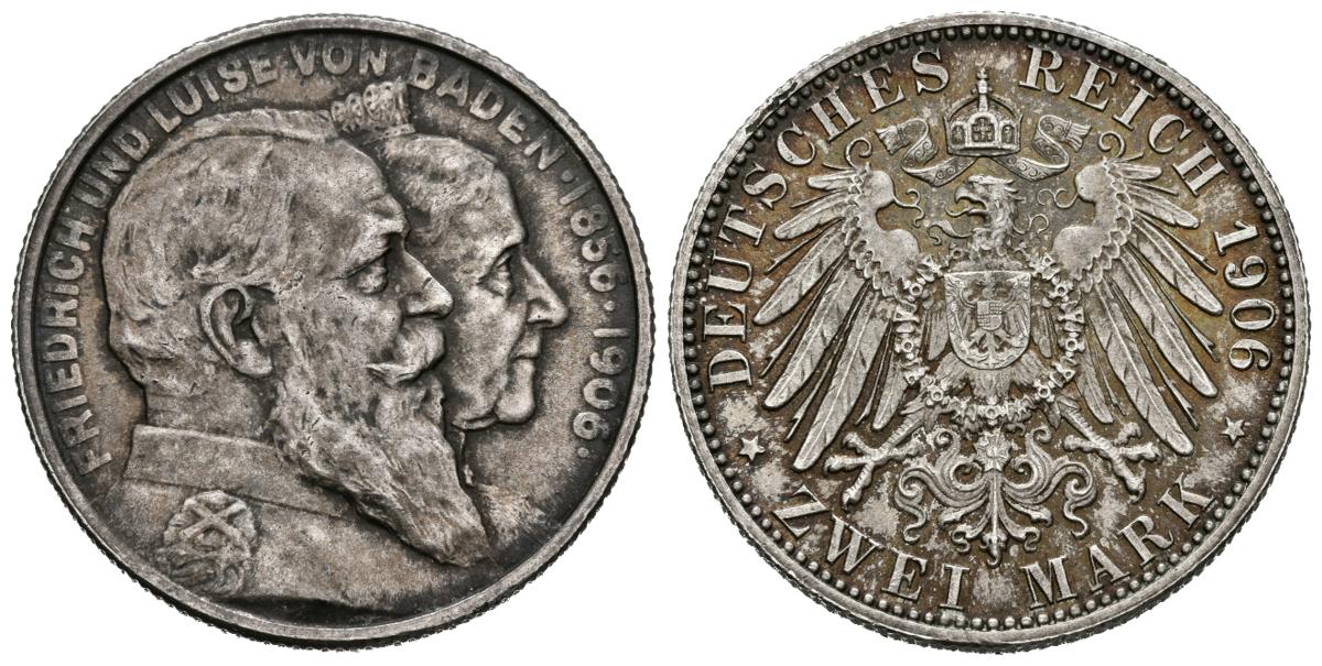 ALEMANIA. 2 Mark (Ar. 11,13g/28mm). 1906. Baden. 50 Aniversario de Boda del Gran Duque Federico I Y Luisa de Prusia. (Km#726). MBC/MBC+.