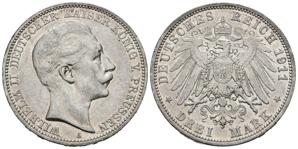 ALEMANIA. 3 Mark (Ar. 16,71g/33mm). 1911. Wilhelm II. Berlín. A. (Km#527). EBC-. Pequeñas rayitas en anverso.