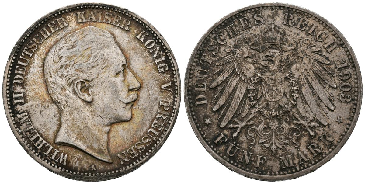 ALEMANIA, wilhelm II. 5 Mark. (Ar. 27,70g/38mm). 1903. Berlín A. (Km#523). MBC+.
