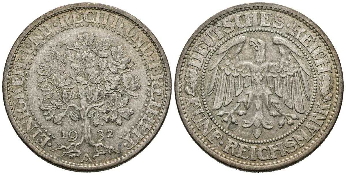 ALEMANIA, Republica de Weimar. 5 Mark (Ar. 25,07g/36mm). 1932. Berlín A. (Km#56). EBC-.