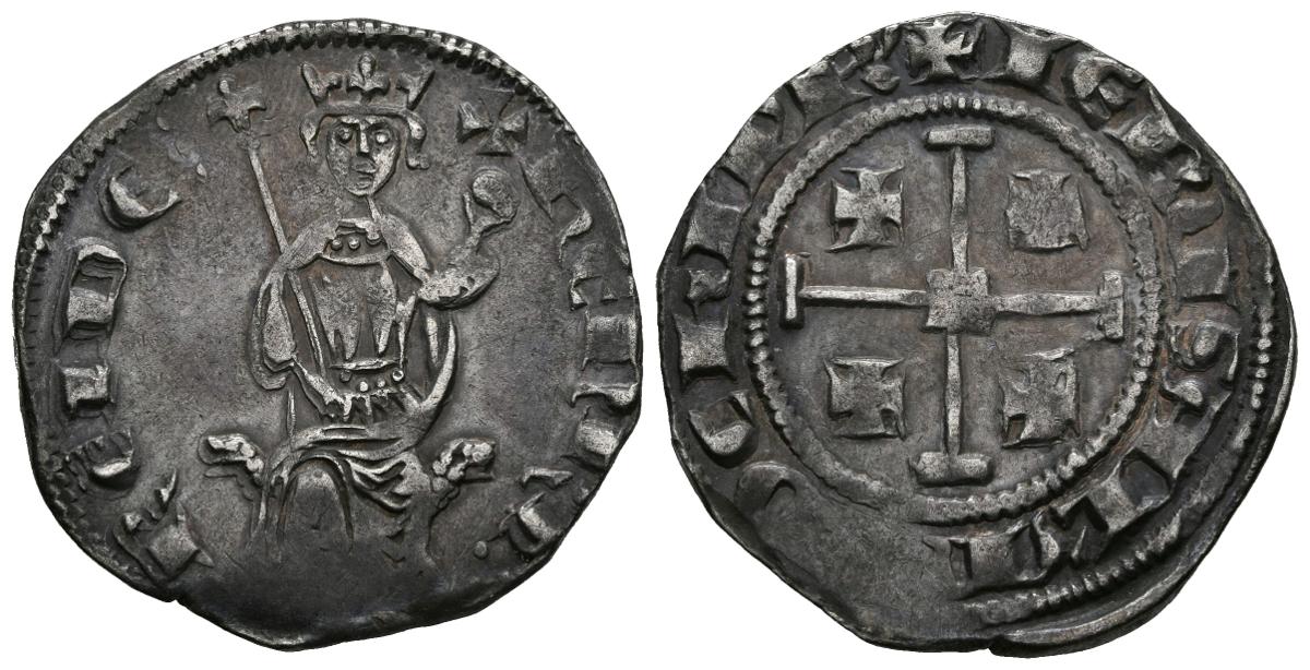 CRUZADAS, Henry II (1310-1324). Gros. (Ar. 4,60g/25mm). Chipre. Anv: HENRI REI DE. Henry II sentado de frente en trono sosteniendo cetro y globo. Rev: IERVSALEM ED CHIPR. Cruz de Jerusalén, con cruzes en los 4 sectores. (Metcalf 687). MBC+.