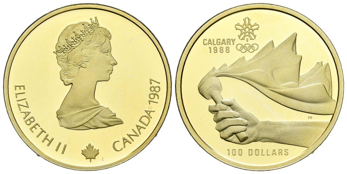 CANADA. 100 Dollars (Au-Ar. 13,42g/27mm). 1987. Juegos de Invierno de Calgary 1988. (Km#158). Proof. Incluye certificado de autenticidad y estuche original. Composición en oro 58,3%.
