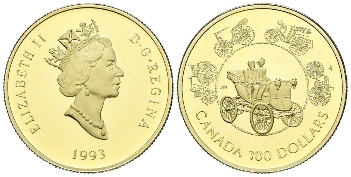 CANADA. 100 Dollars (Au-Ar. 13,45g/27mm). 1993. Primeros automóviles. (Km#245). Proof. Incluye certificado de autenticidad y estuche original. Composición en oro 58,3%.