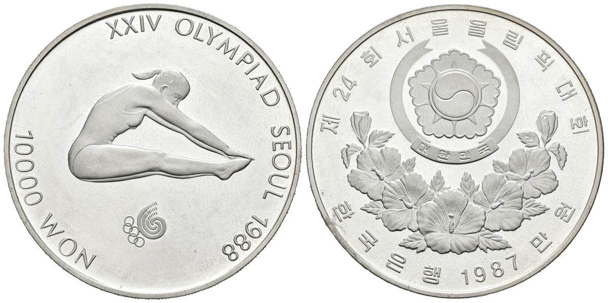 COREA DEL SUR. 10.000 Won. (Ar. 33,36g/40mm). 1987. Juegos Olímpicos de Seúl 1988. Salto. (Km#57). PROOF.