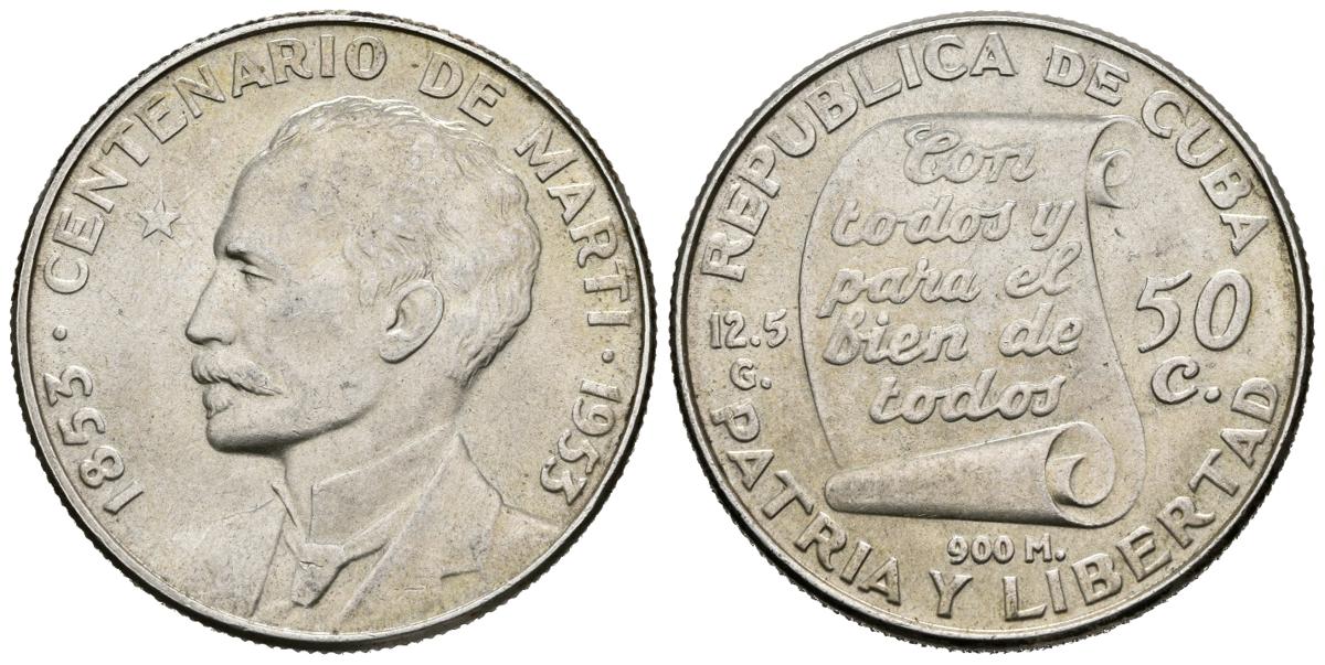 CUBA. 50 Centavos. (Ar. 12,46g/30mm). 1953. Centenario de José Martí. (Km#28). EBC.