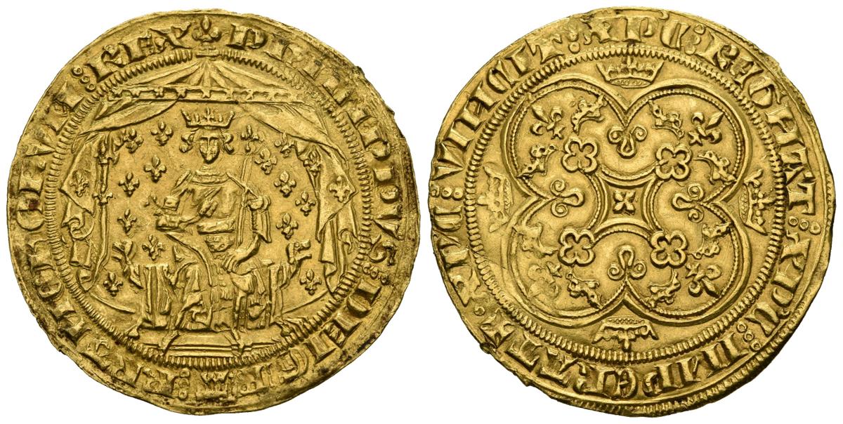 FRANCIA, Felipe IV de Valois (1328-1350). Pabellón de Oro. (Au. 5,01g/31mm). Anv: PHILIPPVS DEI GRA FRANCHORVM REX. Felipe IV coronado sentado de frente portado cetro, bajo pabellón drapeado, alrededor del rey flores de lis. Rev: XPC VINCIT XPC REGNAT SPC IMPERAT. Cruz arqueada con flores de lis en sus extremos dentro de cuadrilobulado con coronas en sus extremos. (Duplessy 251). EBC+. Rarísimo y precioso ejemplar escaso en esta espectacular calidad.