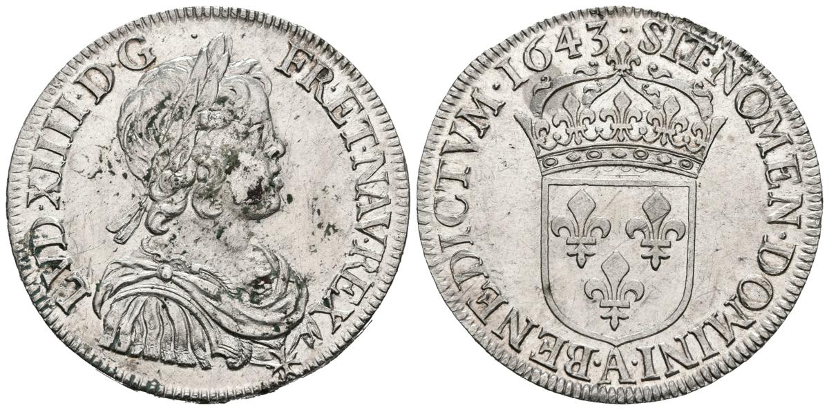 FRANCIA, Luis XIV (1643-1715). 1/2 Ecu. (Ar. 13,70g/33mm). 1643. París A. (Gadoury 168). SC. Precioso ejemplar escaso así. Brillo original.