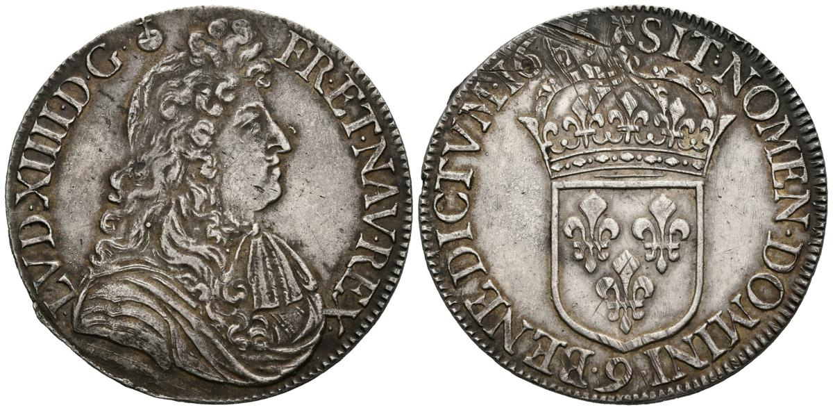 FRANCIA, Luis XIV (1643-1715). 1 Ecu. (Ar. 27,25g/40mm). 1685. Rennes 9. (Gadoury 210). EBC-. Rarísimo ejemplar, en el catálogo Gadoury catalogan este ejemplar con R5. Preciosa pátina.