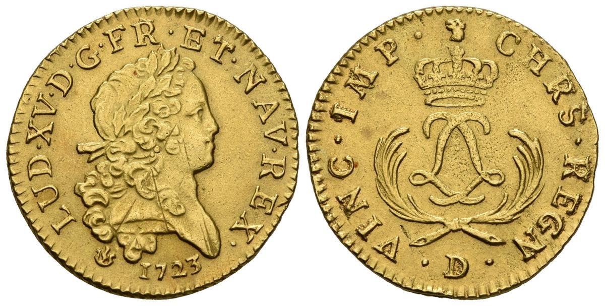 FRANCIA, Luis XV (1715-1774). Luis de Oro. (Au. 6,49g/23mm). 1723. Lyon. (Gadoury 338). EBC-. Limpiada.