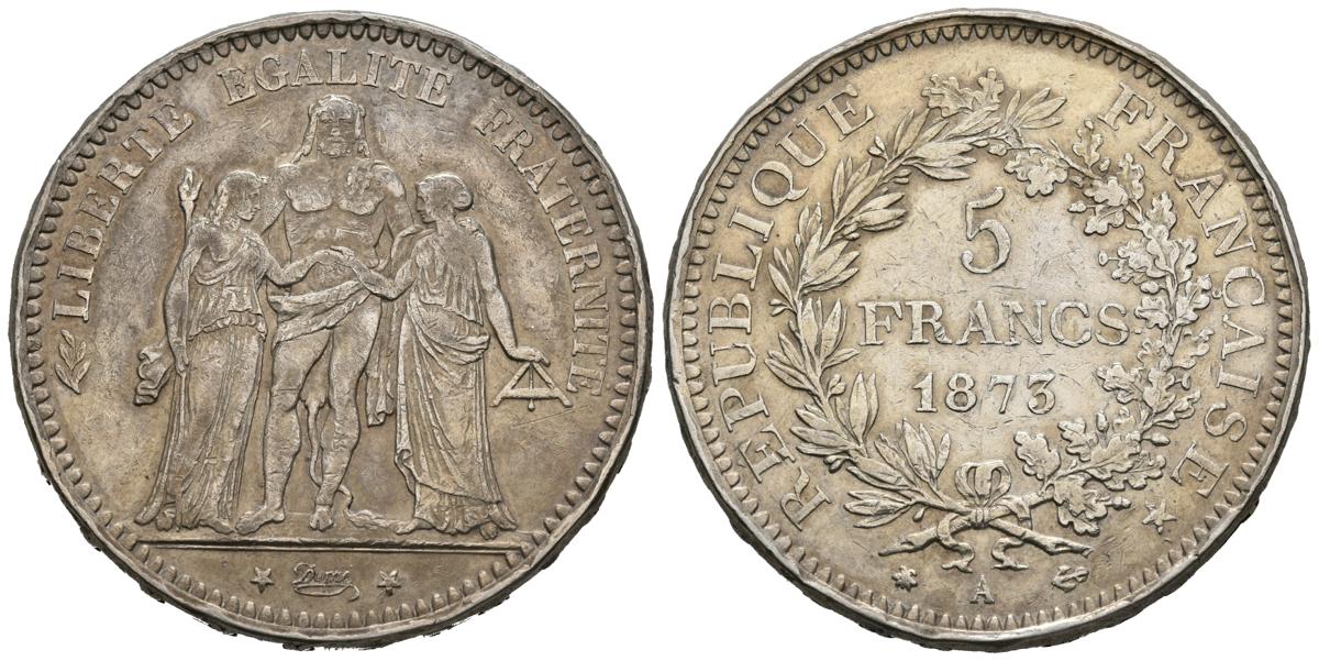 FRANCIA, III República. 5 Francs. (Ar. 24,86g/37mm). 1873. París A. (Km#820.1). MBC+