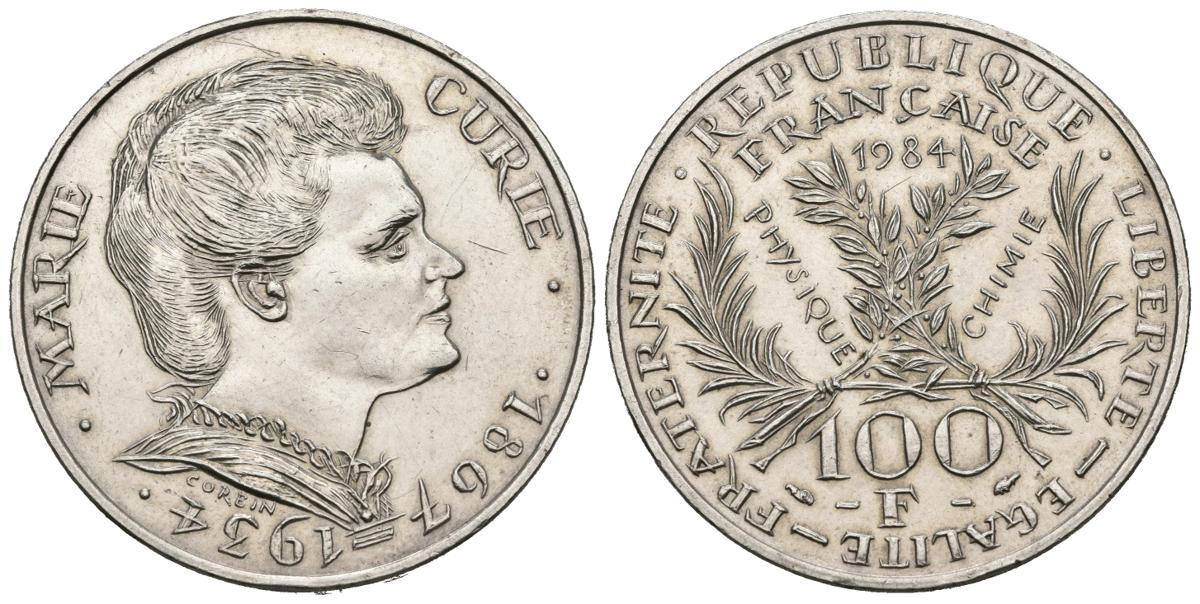 FRANCIA, Marie Curie (1867-1934). 100 Francs. (Ar. 15,00g/31mm). 1984. (Gadoury 899). EBC+. Rayitas de limpieza.