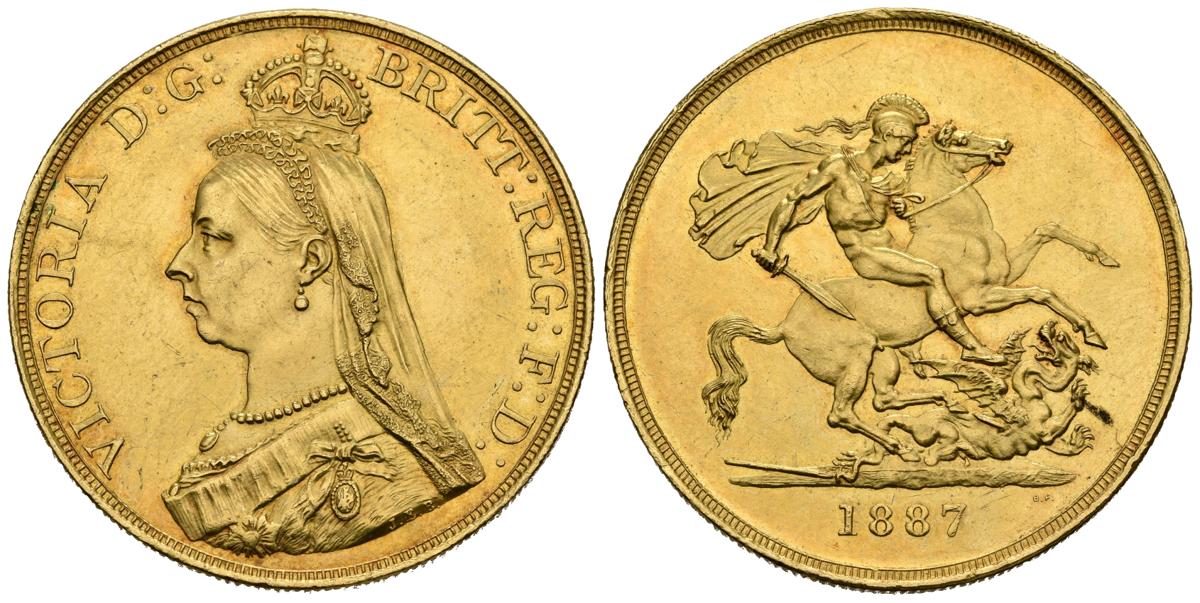 GRAN BRETAÑA, Victoria (1837-1901). 5 Libras. (Au. 40,00g/36mm). 1887. (Km#769). SC. Restos de brillo original.