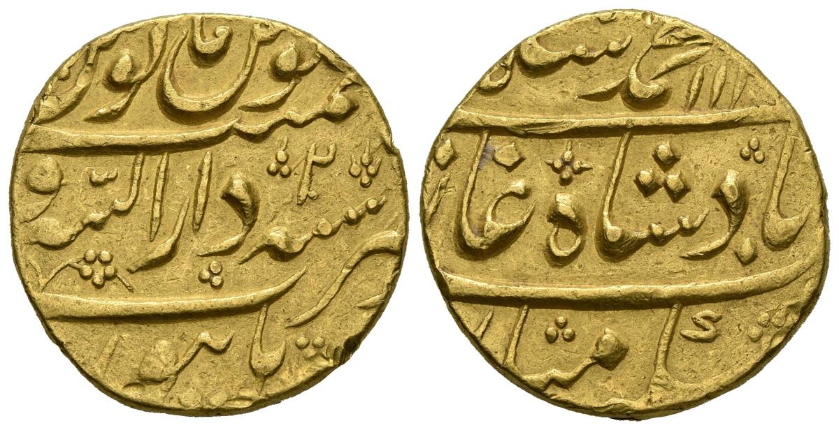 INDIA, Muhammad Shah (1131-1161H). Mohur de oro. (Au. 11,00g/21mm). ¿1134H (Año 3)?. ¿Khujista Bunyad?. (Km#438.13). EBC-.