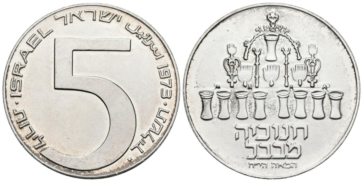 ISRAEL. 5 Lirot. (Ar. 20,07g/34mm). 1973. (Km#75.1). SC. Rayitas de limpieza.