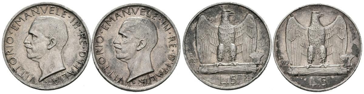 ITALIA. Conjunto de 2 monedas de 5 Liras de plata de los años 1927 y 1929. Reinado de Víctor Manuel III. Diferentes estados de conservación. A EXAMINAR.