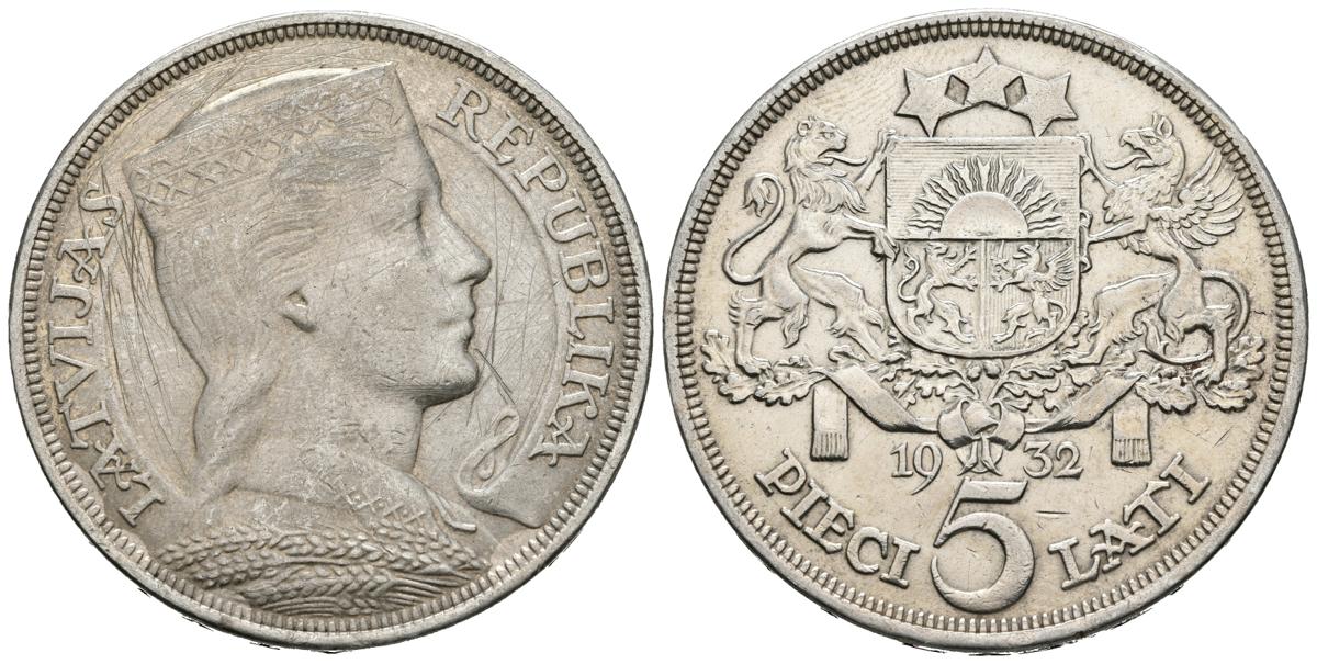 LETONIA. 5 Lati. (Ar. 24,89g/37mm). 1932. (Km#9). EBC+.
