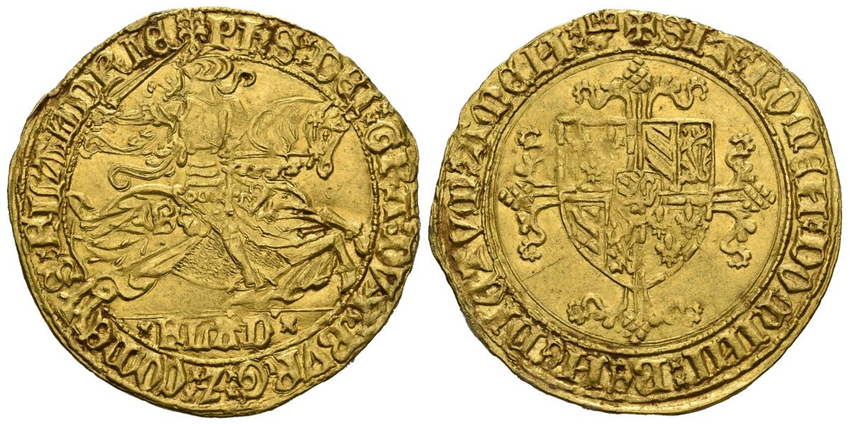 PAISES BAJOS, Felipe el Bueno (1419-1467). Caballero de Oro. (Au. 3,61g/28mm). Flandes. Anv: PHS DEI GRA DVX BVRG Z COME S FLAHDRIE. Caballero con armadura y espada cabalgando sobre caballo a derecha. Rev: SIT NOMEN DOMINI BENEDICTVM AMEN. Escudo de Borgoña con el de Flandes superpuesto en una cruz ornamentada con flores. (Delmonte 487). EBC+. Precioso y raro ejemplar en esta espectacular calidad.