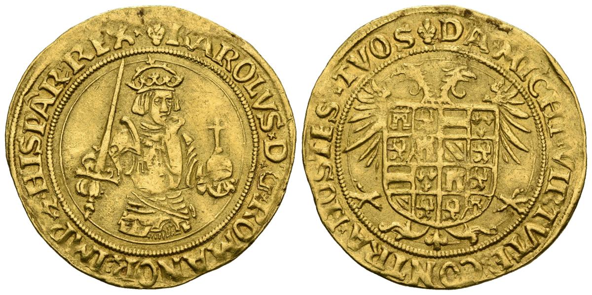 FLANDES, Carlos V (1521-1556). Real de Oro. (Au. 5,24g/28mm). Brujas. Anv: KAROLVS D G ROMANOR IMP Z HISP REX. Carlos V coronado estante a derecha portando globo crucífero y espada. Rev: DA MICHI VIRTVTEM CONTR ROMANO TVOS. Escudo sobre águila imperial con dos cabezas. (Delmonte 515). MBC+. Raro y bonito ejemplar.