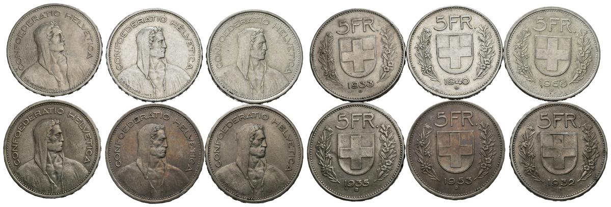 SUIZA. Interesante conjunto formado por 6 monedas de 5 Francos de plata con fechas comprendidas entre 1932 y 1966. Ceca de Berna. Diferentes estados de conservación. A EXAMINAR