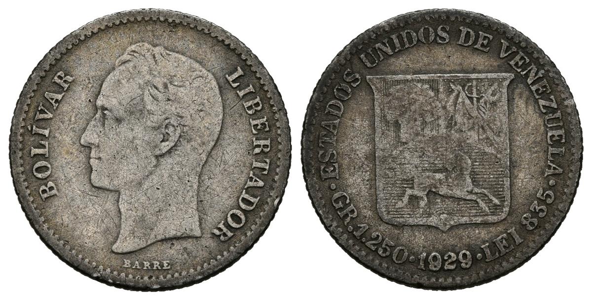 ESTADOS UNIDOS DE VENEZUELA. 1/4 Bolívar. (Ar. 1,17g/15mm). 1929. París. (KM#Y20). MBC/MBC-.