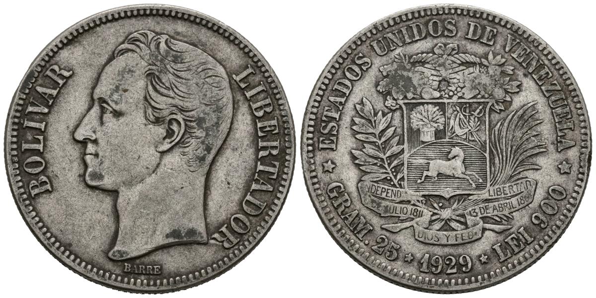 ESTADOS UNIDOS DE VENEZUELA. 5 Bolívares. (Ar. 24,99g/37mm). 1929. Philadelphia. (Km#Y24.2). MBC.