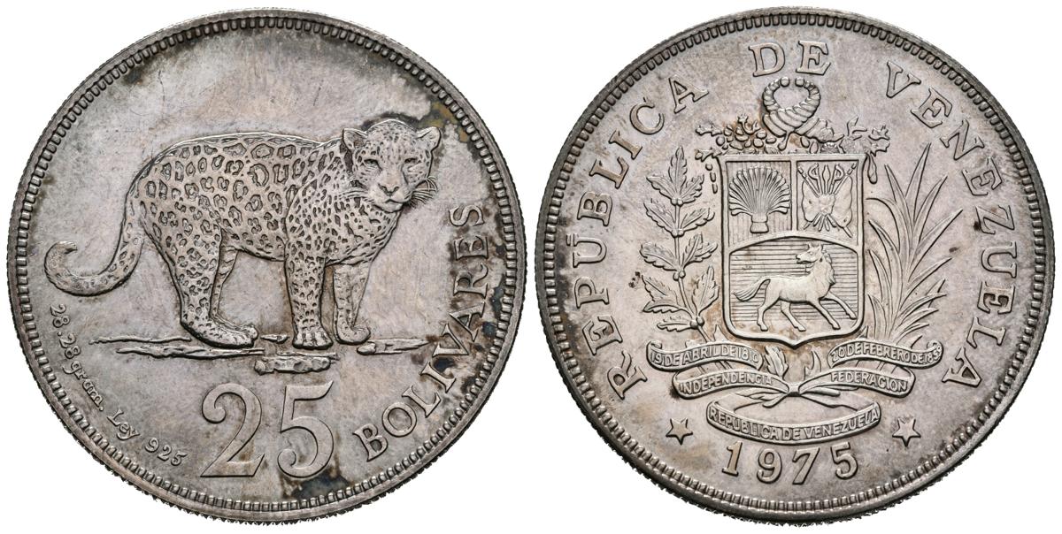 REPUBLICA DE VENEZUELA. 25 Bolívares. (Ar. 28635g/38mm). 1975. Londres. (Km#Y46). SC. Preciosa pátina.