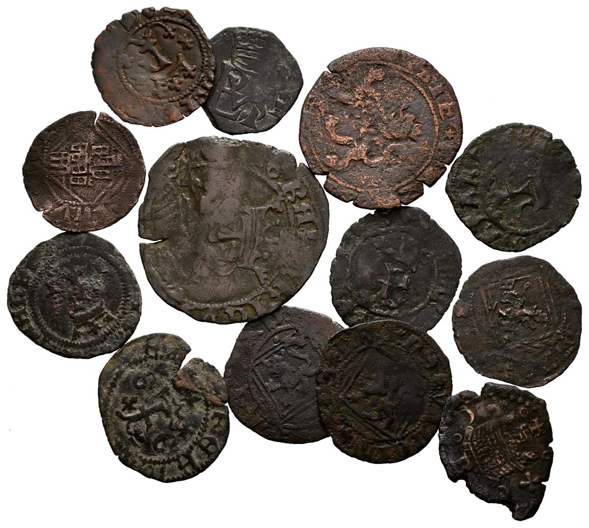 EPOCA MEDIEVAL Y MONARQUIA ESPAÑOLA. Lote compuesto por 13 cobre de distintas épocas de la numismatica epañola, reyes, cecas, valores y fechas. A EXAMINAR.