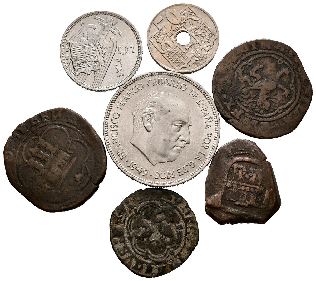 EPOCA MEDIEVAL, MONARQUIA ESPAÑOLA y ESTADO ESPAÑOL. Lote compuesto por 8 monedas de diferentes épocas de la numimática española. A EXAMINAR.