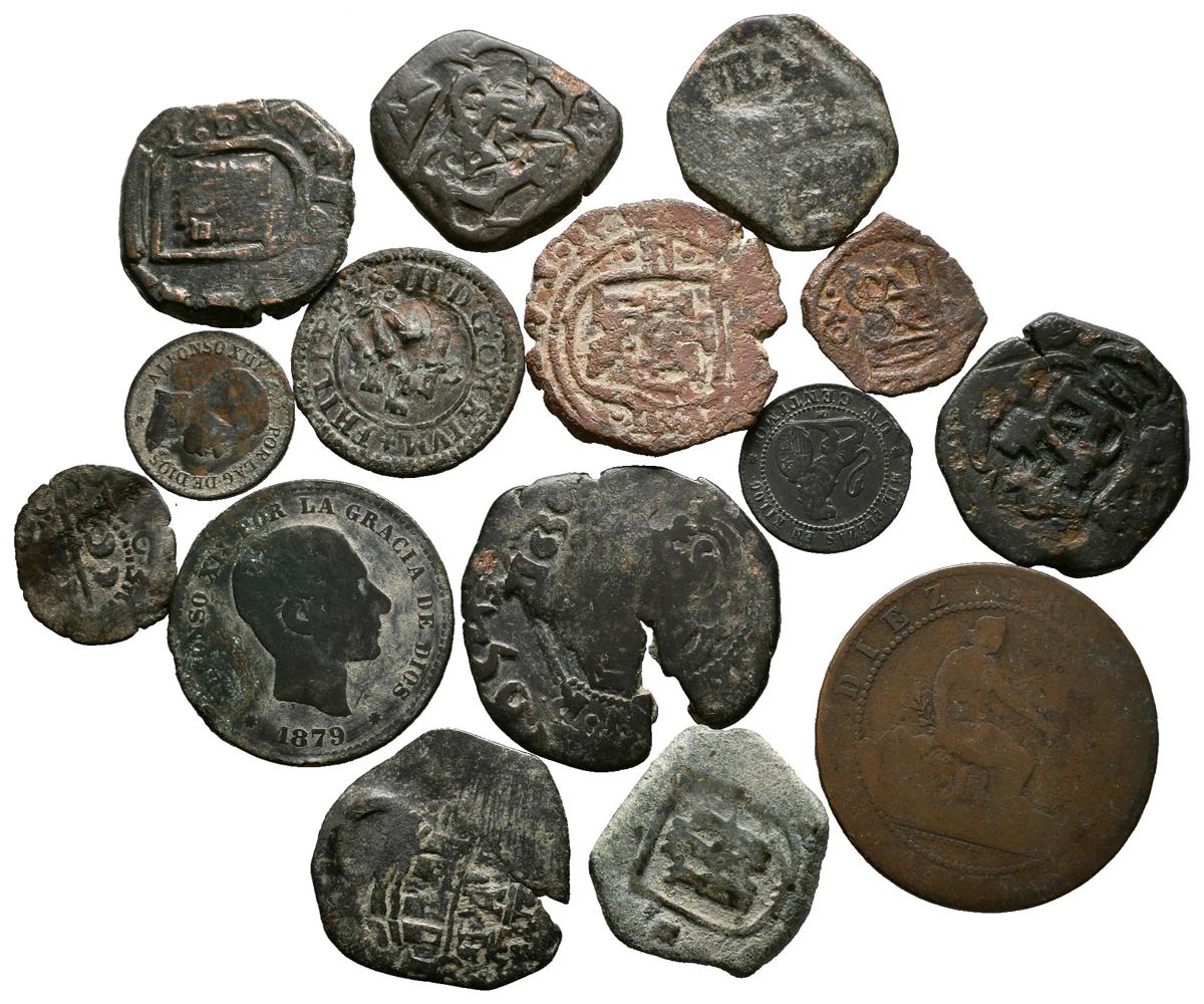 MONARQUIA ESPAÑOLA y CENTENARIO DE LA PESETA. Lote compuesto por 15 bronces de distintos reyes españoles, algunos de ellos resellados. A EXAMINAR.