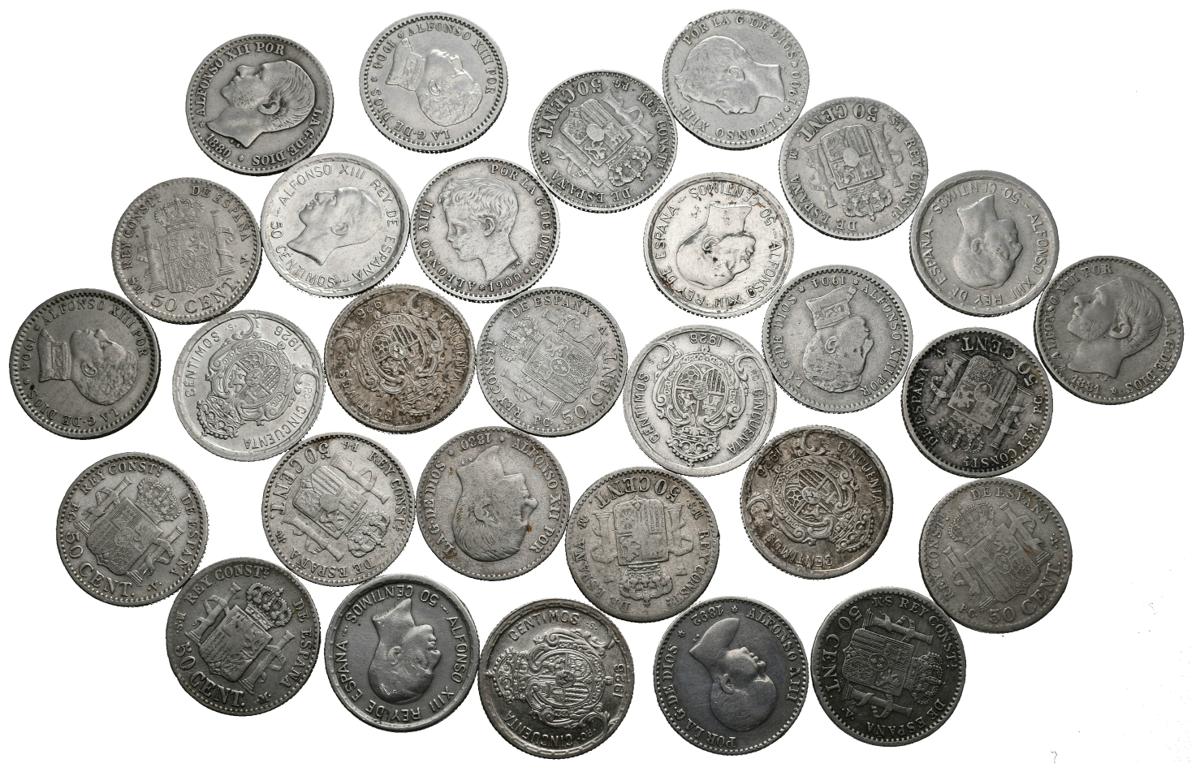 CENTENARIO DE LA PESETA. Magnífico conjunto de 29 piezas de 50 Céntimos acuñadas por los reyes Alfonso XII y XIII. Diferentes fechas así como estados de conservación. A EXAMINAR.