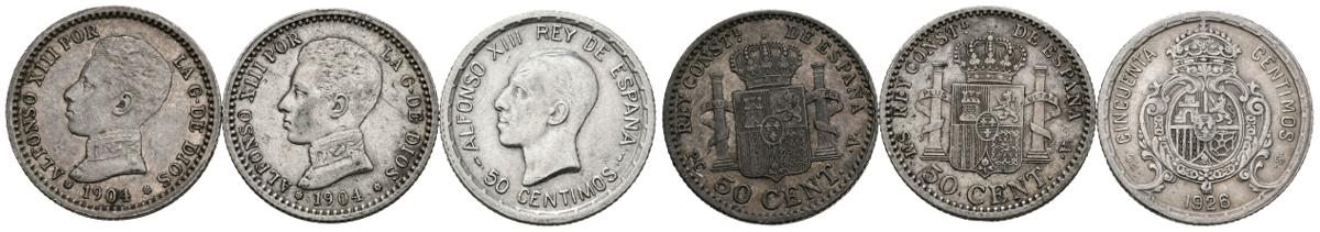 CENTENARIO DE LA PESETA. Conjunto de 3 monedas de 50 Céntimos de Alfonso XIII. A EXAMINAR.