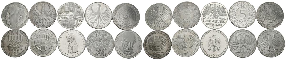 ALEMANIA. Magnifico conjunto de 10 monedas de 5 Marks. Todas diferentes entre sí y de fechas comprendidas entre 1951 y 1977. Alto nivel de conservación general. A EXAMINAR.