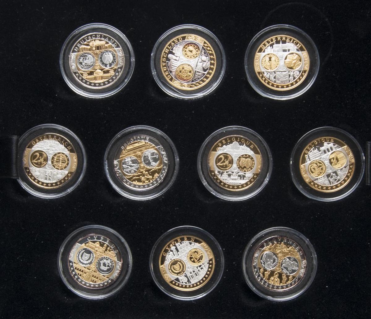 MONEDAS EXTRANJERAS. Precioso conjunto de 48 medallas conmemorativa de las primeras imágenes del Euro. (Cu-Ar-Au. 16,99g/35mm). PROOF. La colección no está completa, a falta de dos piezas, e incluye certificados y presentada en dos maletines.