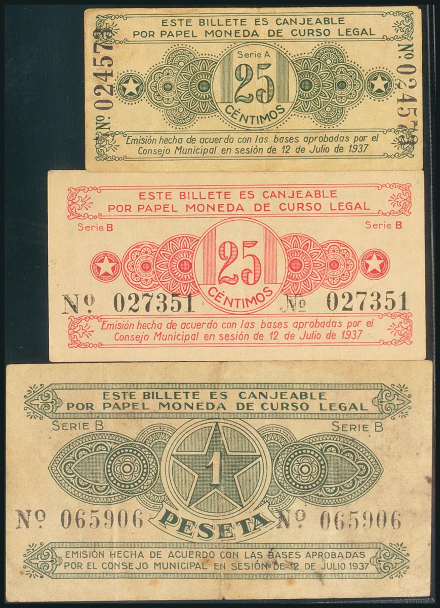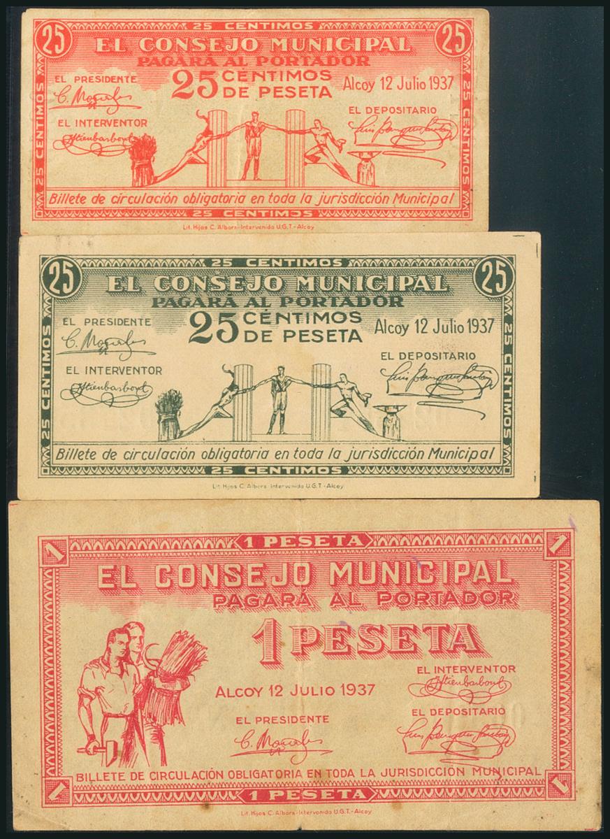 ALCOY (ALICANTE). 25 Céntimos (los dos tipos) y 1 Peseta. 12 de Junio de 1937. Serie A, el primero y B los dos últimos.(González: 377, 378, 380). SC-/MBC+.