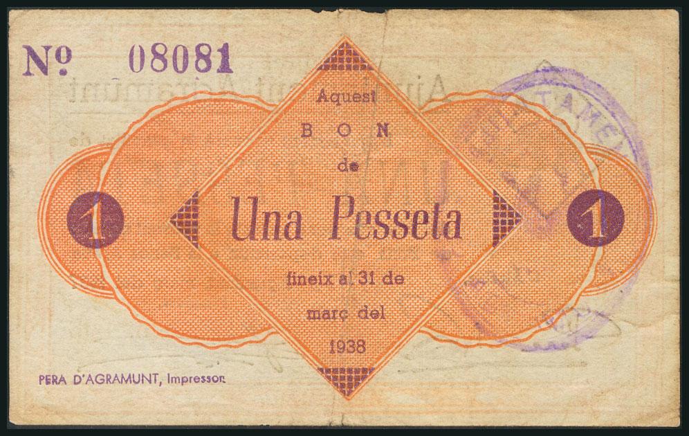 AGRAMUNT (LERIDA). 1 Peseta. Marzo 1937. Con marca de la alcaldía al dorso. (González: 6013). MBC-.