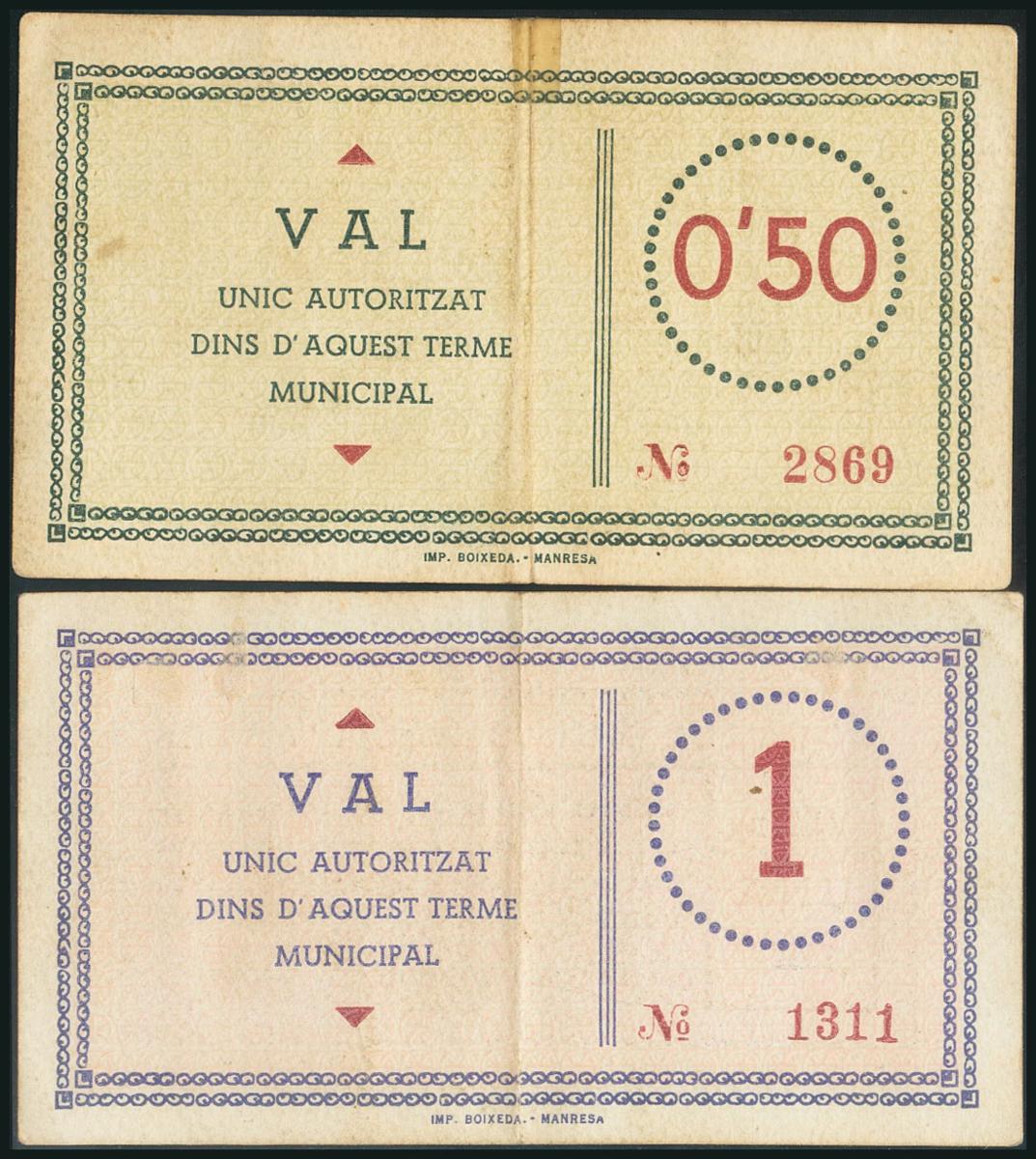 ARTES (BARCELONA). 50 Céntimos y 1 Peseta. Junio 1937. (González: 6411/12). Rara serie completa. MBC.