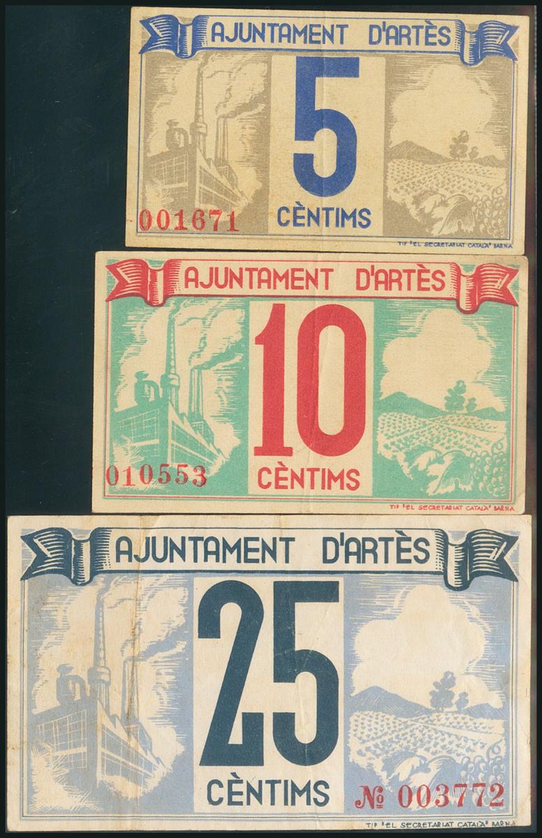 ARTES (BARCELONA). 5 Céntimos, 10 Céntimos y 25 Céntimos. (1938ca). (González: 6413/15). Inusual serie completa. MBC.