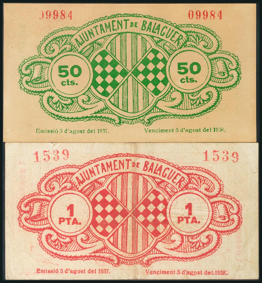 BALAGUER (LERIDA). 50 Céntimos y 1 Peseta. 5 de Agosto de 1937. (González: 6487/88). EBC/MBC+.