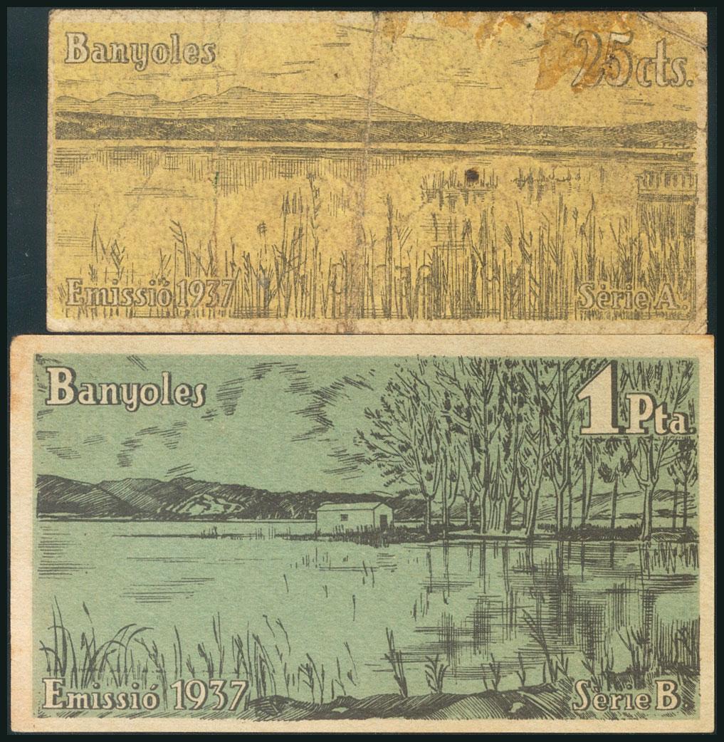 BANYOLES (GERONA). 25 Céntimos y 1 Peseta. 17 de Agosto de 1937. Series A y B, respectivamente. (González: 6506/07). Serie completa. MBC.