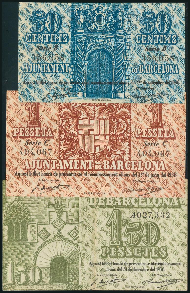 BARCELONA. 50 Céntimos, 1 Peseta y 1´50 Pesetas. 13 de Mayo de 1937 y 30 de Septiembre de 1937. Series B, C y A, respectivamente. (González: 6520, 6521 y 6522). SC-.
