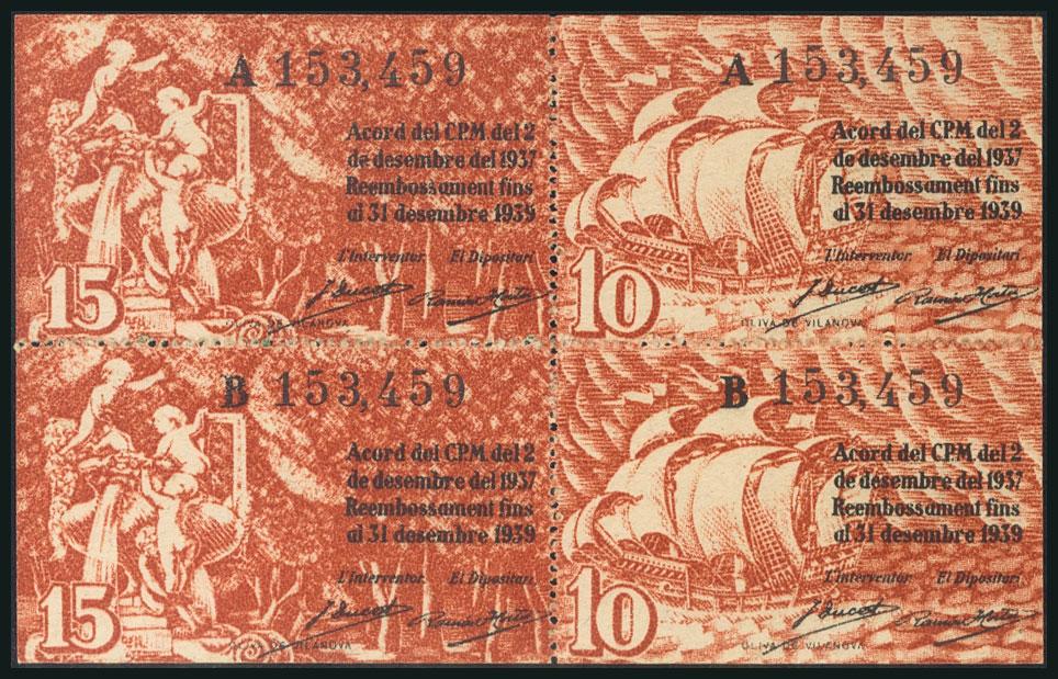 BARCELONA. 10 Céntimos (2) y 15 Céntimos (2) (unidos en un bloque de cuatro). 2 de Diciembre de 1937. Serie A y B. (González: 6523/24). SC.