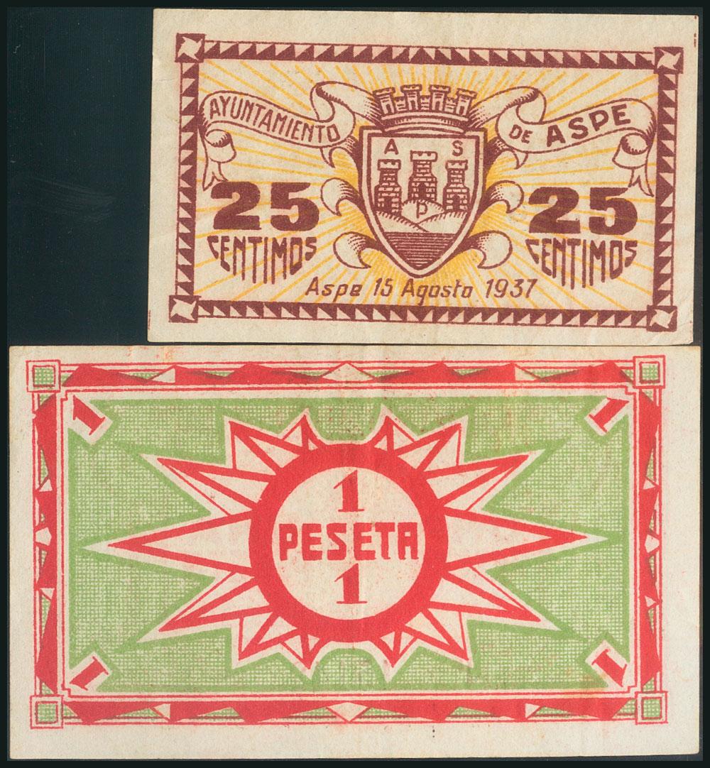 ASPE (ALICANTE). 25 Céntimos y 1 Peseta. 15 de Agosto de 1937. (González: 788). Inusuales. MBC+.