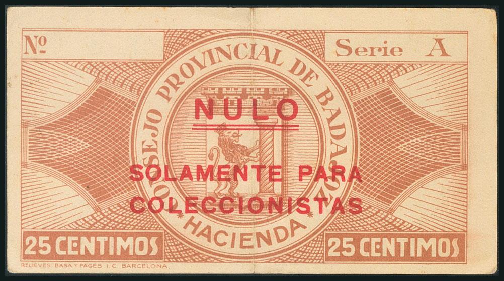 BADAJOZ. 25 Céntimos. 1 de Octubre de 1937. Serie y con sello "NULO" único para coleccionistas y sin numeración. (González: 834). MBC+.