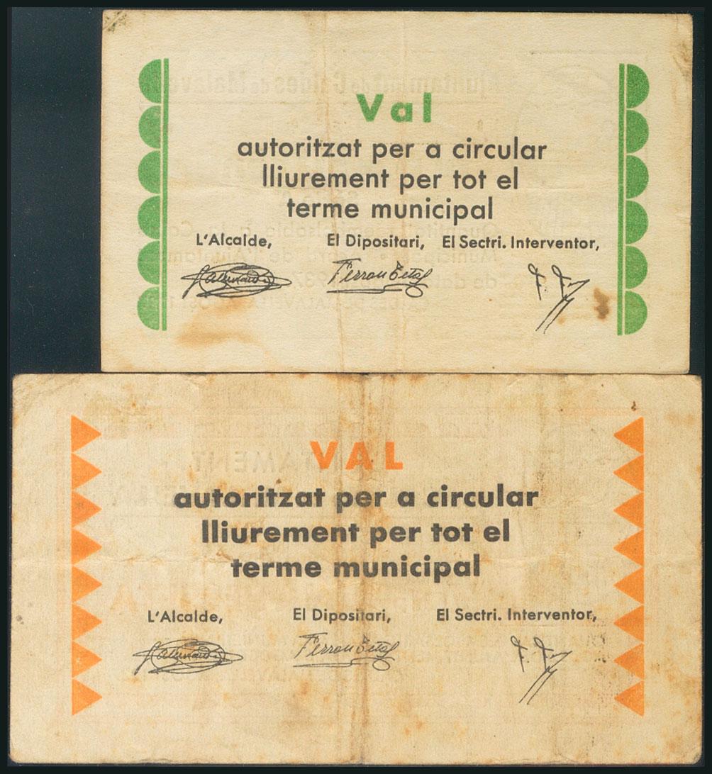 CALDES DE MALAVELLA (GERONA). 50 Céntimos y 1 Peseta. Agosto 1937. Serie A, ambos. (González: 7279, 7280). Raros. MBC/MBC+.