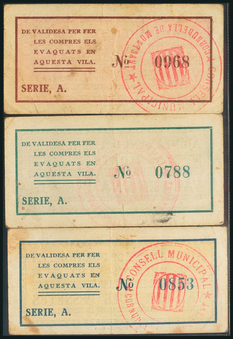CORNUDELLA DE MONTSANT (TARRAGONA). 50 Céntimos, 1 Peseta y 2 Pesetas. (1938ca). (González: 7692/94). Serie completa muy rara. MBC+.