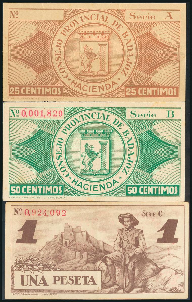 BADAJOZ. 25 Céntimos, 50 Céntimos y 1 Peseta. 1 de Octubre de 1937. Series A, B y C, respectivamente (el 25 Céntimos sin numeración). (González: 834/36). Inusual serie completa. MBC/EBC+.