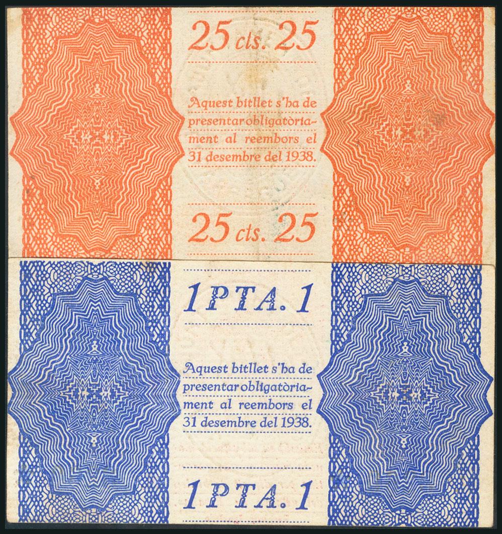 ESPARREGUERA (BARCELONA). 25 Céntimos y 1 Peseta. Septiembre 1937. Serie A, ambos. (González: 7748/49). Inusual serie completa en esta conservación. EBC.