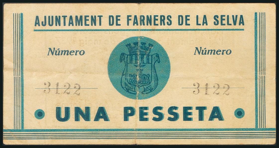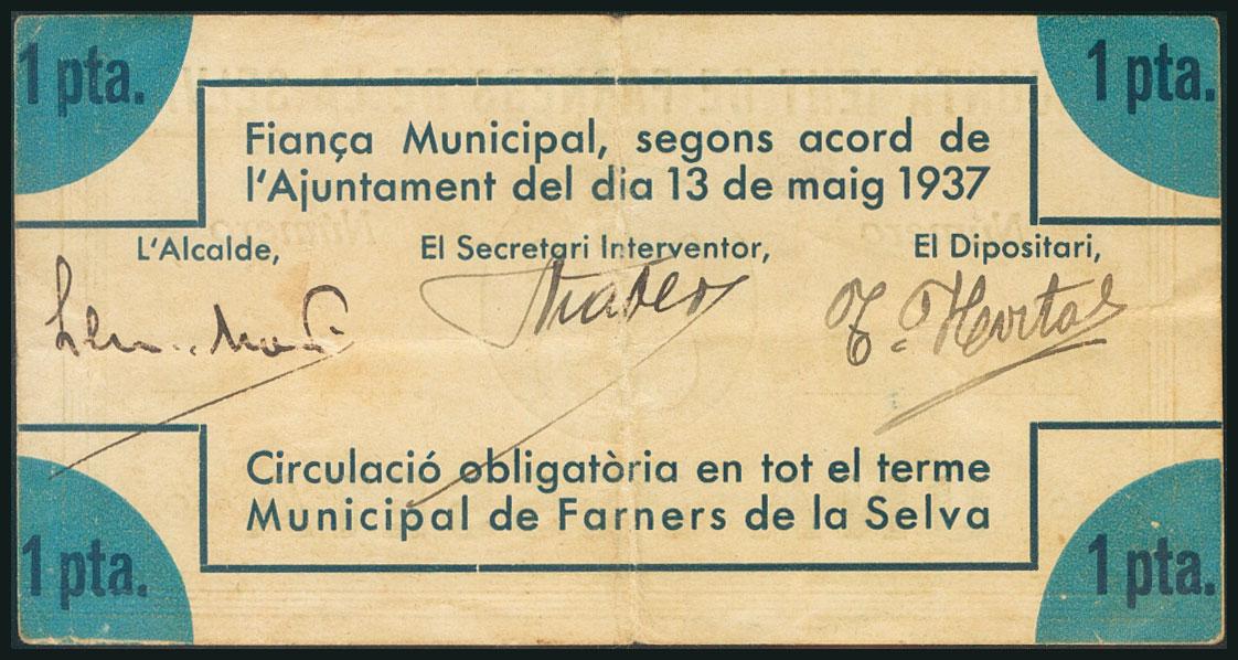 FARNERS DE LA SELVA (GERONA). 1 Peseta. 13 de Mayo de 1937. (González: 7828). Inusual. BC.