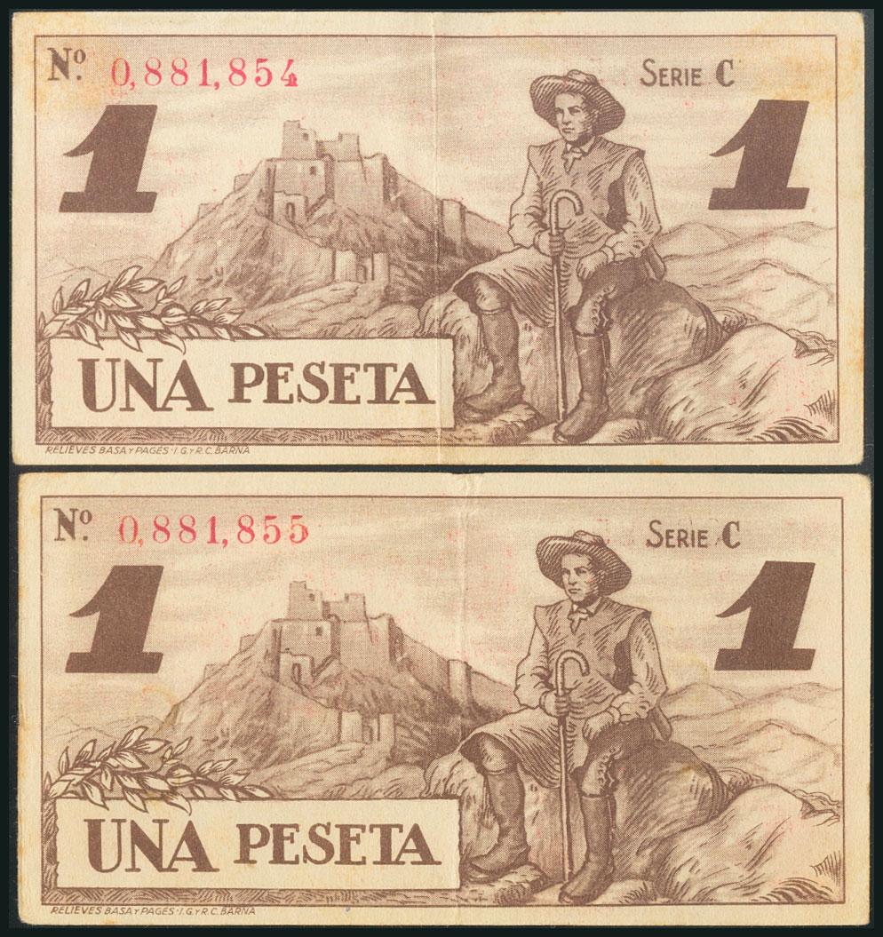 BADAJOZ. 1 Peseta. 1 de Octubre de 1937. Pareja correlativa. Serie C. (González: 836). MBC.