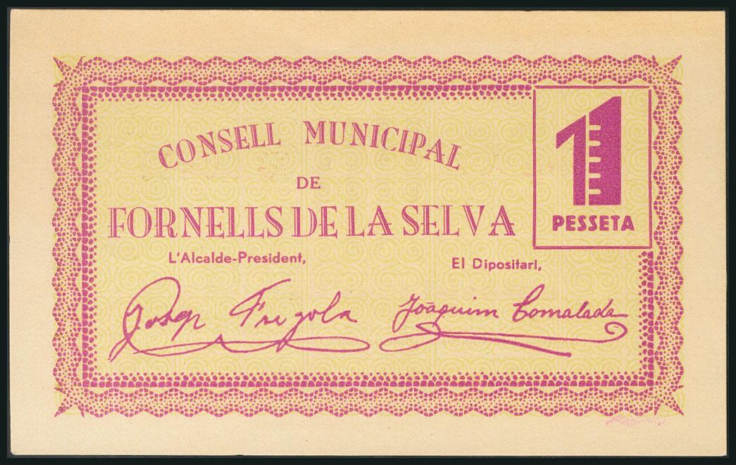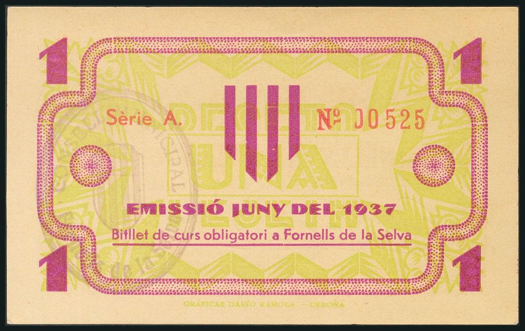 FORNELLS DE LA SELVA (GERONA). 1 Peseta. Junio 1937. Serie A. (González: 7925). Rarísimo. SC.